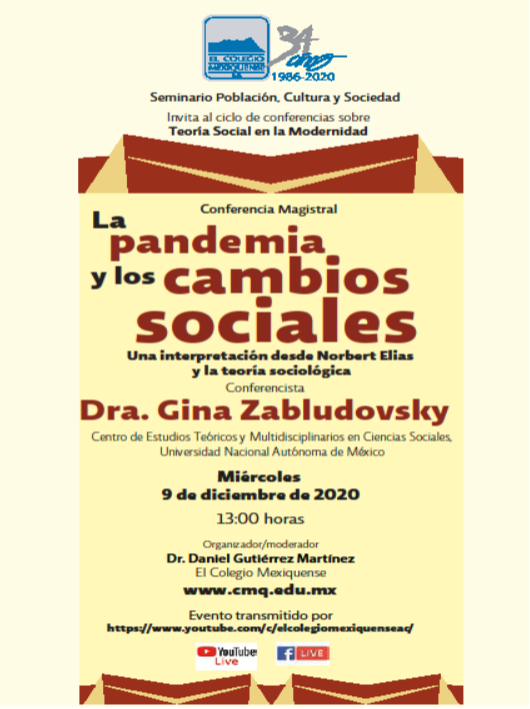 El día miércoles 9 diciembre a las 13:00 hrs, presentaré mi conferencia magistral, «La pandemia y los cambios sociales: Una interpretación desde Norbert Elias y la teoría sociológica«, para el Seminario Población, Cultura y Sociedad en el ciclo de conferencias sobre Teoría Social en la Modernidad . Colegio Mexiquense