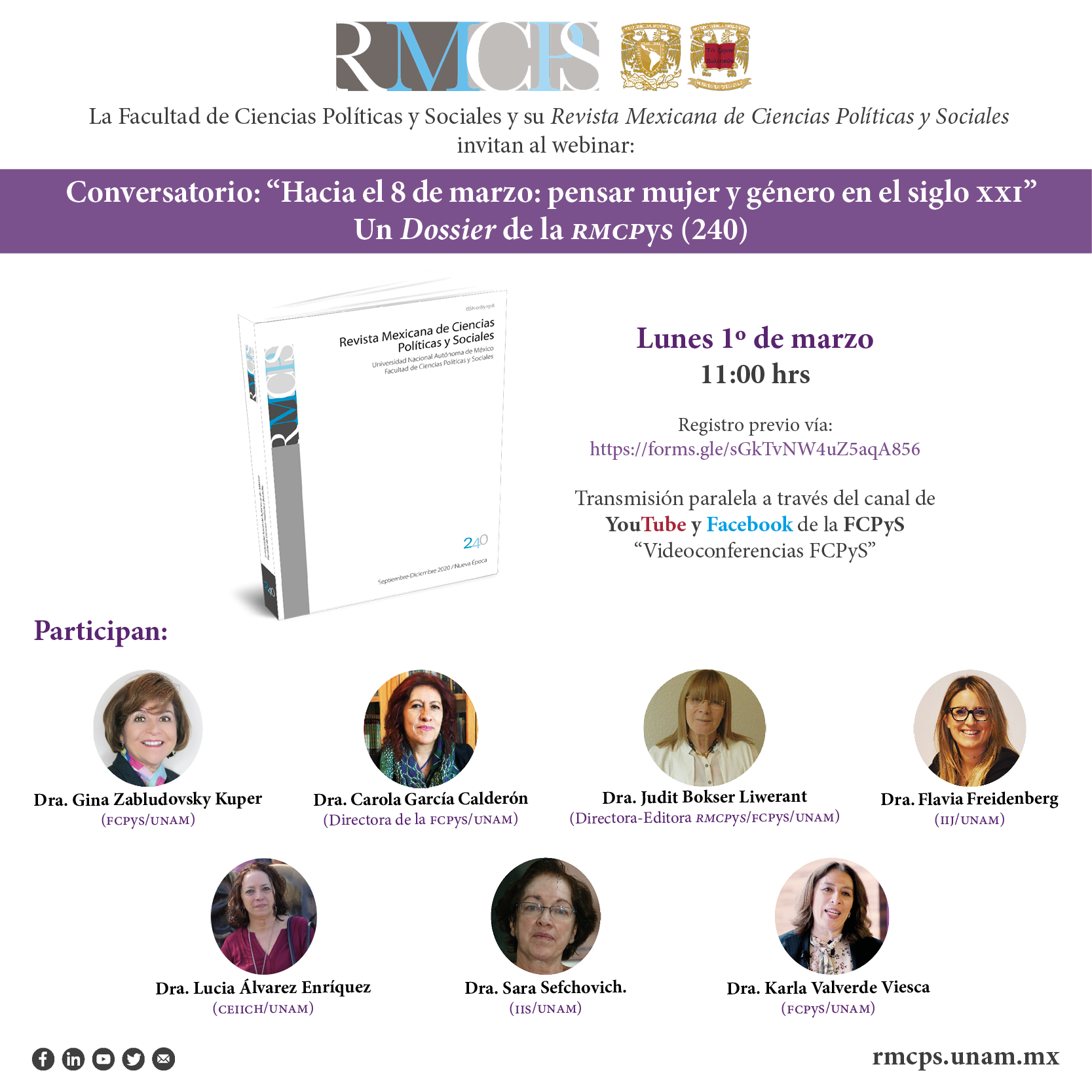 El evento será transmitido paralelamente por YouTube y Facebook de la FCPyS «Videoconferencias FCPyS».