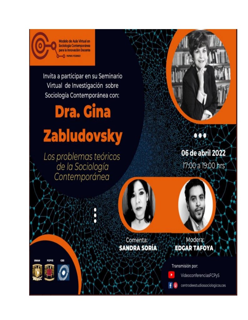 El día 6 de abril a las 17:00 hrs, estaré presentando mi conferencia magistral “Los problemas teóricos actuales de la sociología contemporánea” para Seminario Virtual de Investigación sobre Sociología Contemporánea.