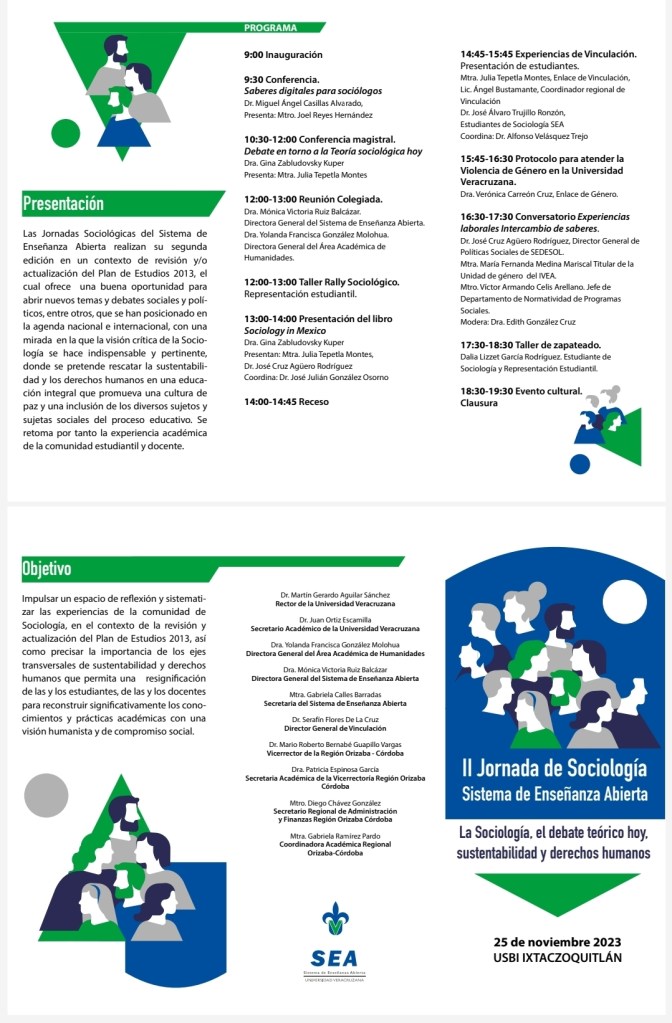 El día sábado 25 de noviembre de 10:30 a 12 hrs, estará presentando su Conferencia magistral: «Debate en torno a la Teoría sociológica hoy», para las II Jornadas de Sociología: Sistema de Enseñanza Abierta.La Sociologia, el debate teórico hoy, sustentabilidad y derechos humanos.