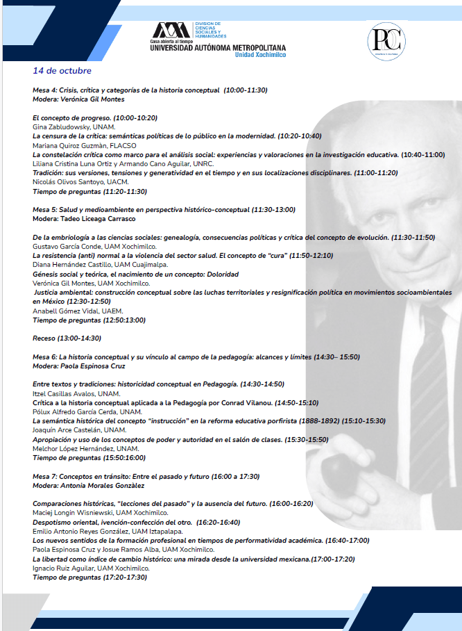 El día 13 de octubre a las 10:00 hrs estaré participando en la Mesa 4: «Crisis, crítica y categorías de la historia conceptual», con el tema «El concepto de progreso», dentro del coloquio Historia de los conceptos y trayectorias conceptuales en la práctica disciplinar de las ciencias sociales y las humanidades.